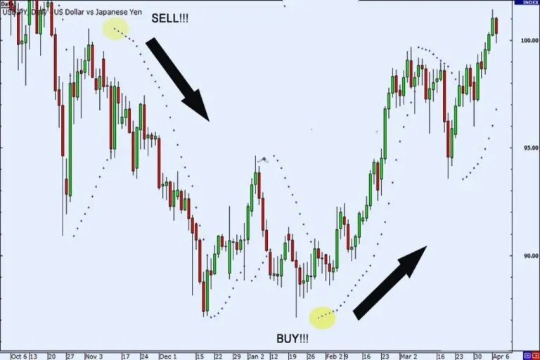Ketika titik-titik berada di bawah candle, itu adalah sinyal BUY (beli). Sebaliknya, ketika titik-titik berada di atas candle, itu adalah sinyal SELL (jual).